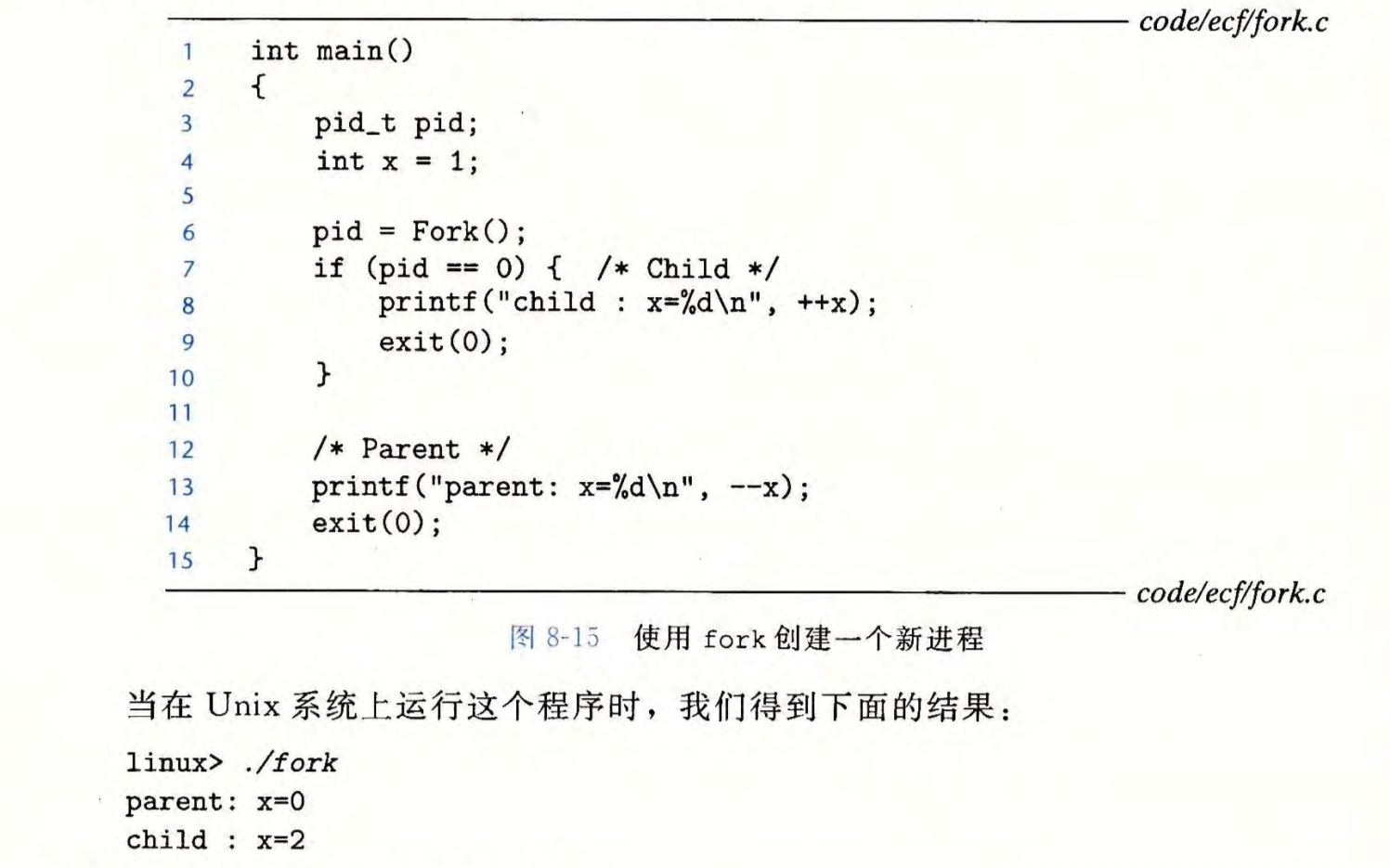 fork创建一个子进程,该子进程被创建时几乎是父进程的一份拷贝,享有私有地址空间,与父进程并发地运行。当前进程为父进程的时候,返回值为创建的子进程的pid;当前进程为新的子进程的时候,返回值为0;由此可以判断当前执行的是子进程还是父进程。子进程与父进程交替执行的顺序未知,由调度器决定