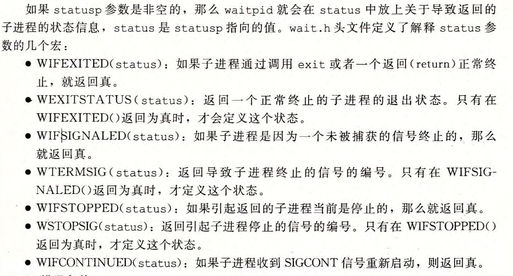 在该函数调用完毕后,statusp指向的值会被改为导致子进程返回的信息,可以通过以下几个宏进行查看