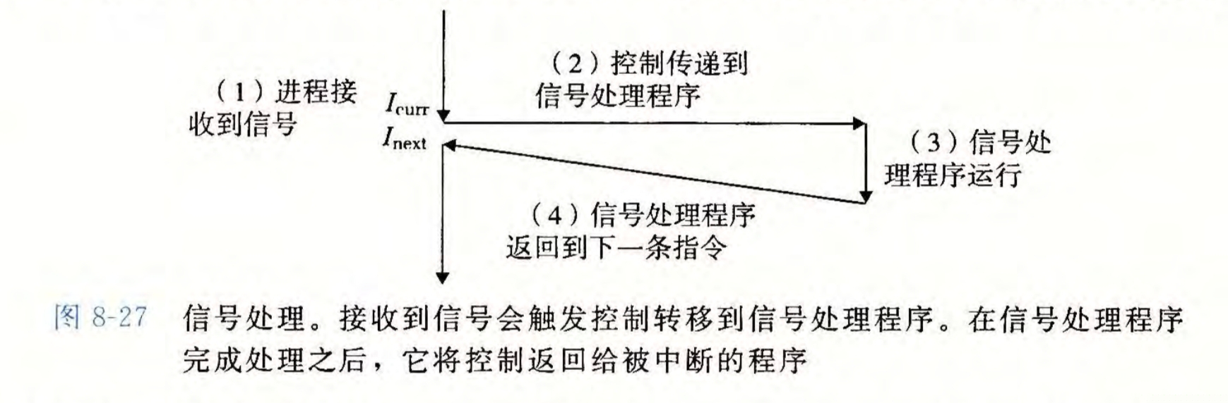 当一个系统事件发生时,内核会将对应的信号发送给相应的进程,该进程以某种方式对信号做出回应,称为接收了该信号