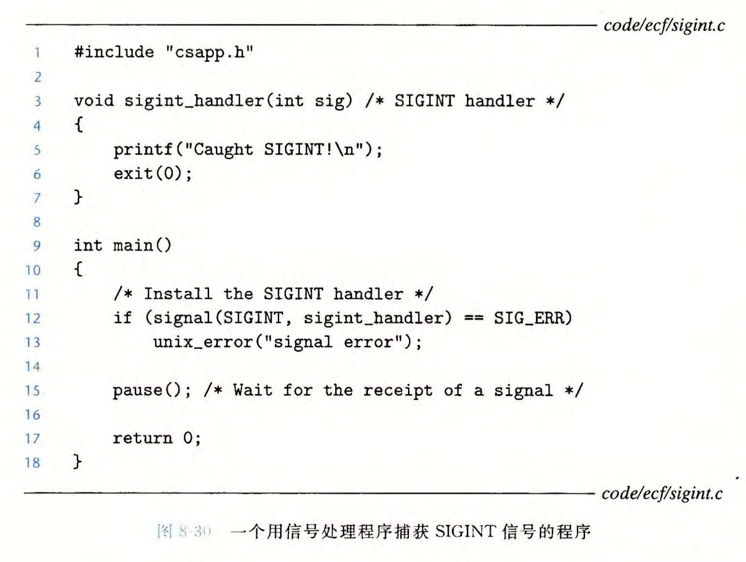 C中可以通过signal函数改变除SIGSTOP,SIGKILL以外的信号对应的信号处理程序的行为,原型如下