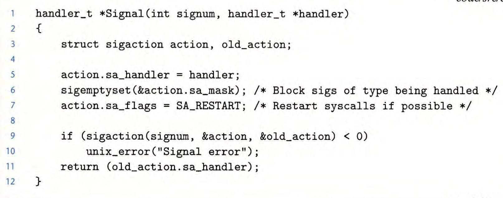 事实上,由于较老的Unix系统对信号的处理行为不同,signal函数可移植性比较差,而sigaction函数具有较好的可移植性,但是调用比较复杂。我们可以通过采用sigaction作为实现,定义与signal行为相同的函数