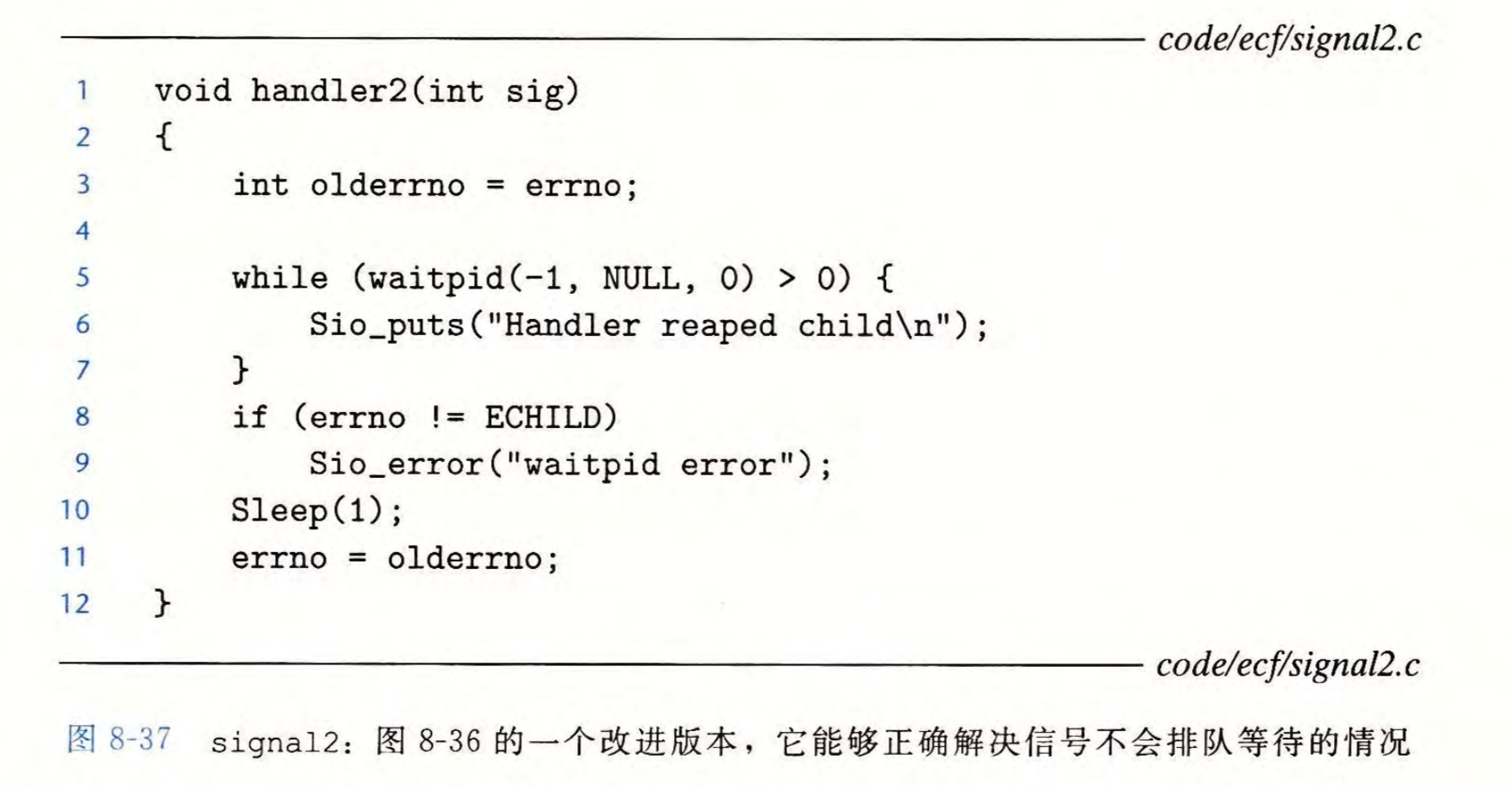例如以下的对SIGCHILD子进程终止的信号处理程序就使用while对信号进行多次处理,防止了僵尸进程