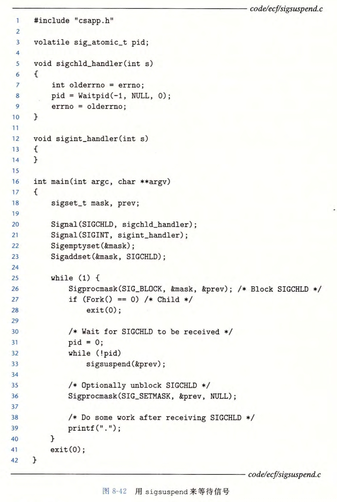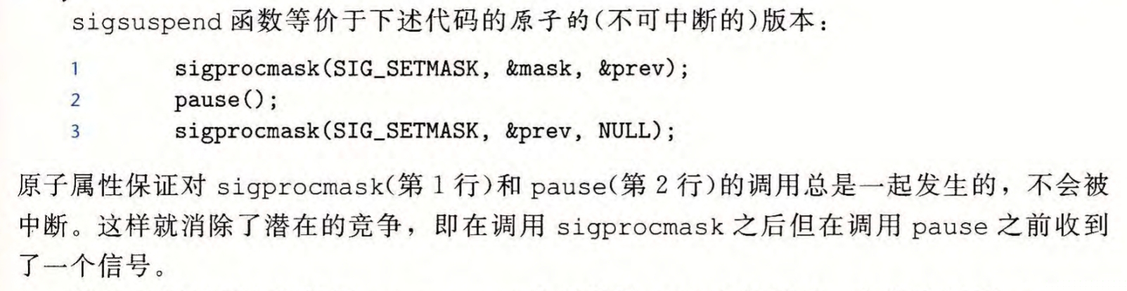 看起来这段代码将当前进程挂起,直到收到了SIGCHILD信号。但是如果SIGCHILD信号在if和pause之间发生,就永远不会接收到信号,导致一直被挂起,所以我们需要让该操作具有原子性,不会被中断。可以使用sigsuspend函数