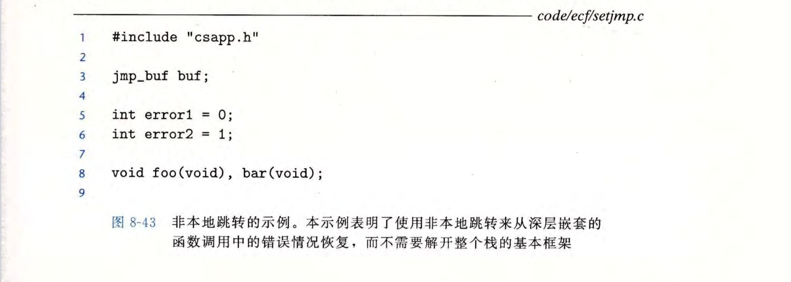 C提供了一种用户级的异常控制流方式,称为非本地跳转,可以直接从一个正在执行的函数转移到另一个函数,使用setjmp,longjmp实现