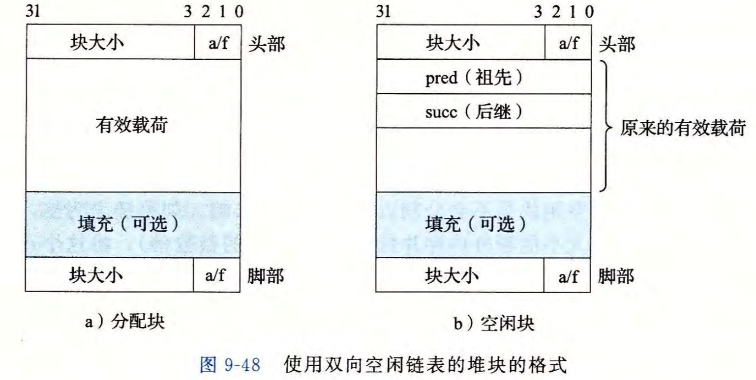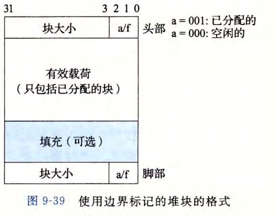 块开头和结尾的头部,脚部是完全相同的,大小都为1个字32位。前29位表示这个块的字节大小(头部与脚部地址的差),由于内存按8字节对齐,所以大小的后三位一定全为0,所以不需要显式地表示出来,可以用来存储其它的信息,比如这个块是空闲的还是已经被分配的。中间分别为这个块的有效载荷和填充。