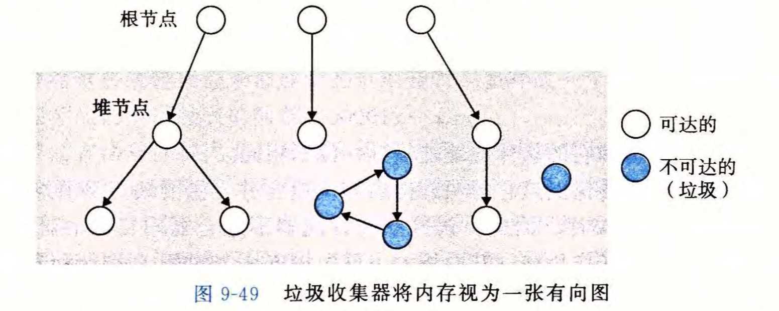 具体而言,当一个内存空间被寄存器,全局变量,用户栈中的变量指向时,这个内存一定需要保持有效。所以我们将后面这些变量看做根节点,已分配块看做是堆节点,当发生a对b的引用时,就连一条a到b的有向边,进而构成了一张有向可达图。所有从根节点出发不可达的堆节点显然就是无用的内存,需要被回收。当malloc找不到空闲块时,就会调用垃圾收集器,从所有根节点出发遍历所有可达的节点并标记,再依次遍历堆,释放所有未被标记的堆节点。然后再次尝试malloc,若还是没有合适的空闲块再尝试向内核获取额外的堆内存
