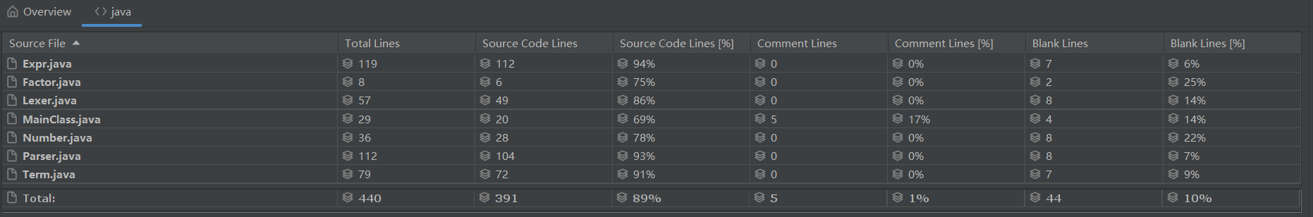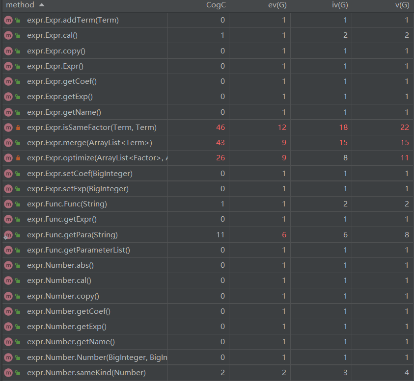 由于Expr.print()方法基本采用“面向过程”的思路编写,导致代码量长,同时方法复杂度也比较高。其次是Parser类中的各方法,由于解析过程情况比较复杂,也导致方法复杂度较高。这与上述分析一致。