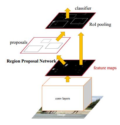 Faster RCNN整个的流程就是使用VGG等网络提取全图的feature map以及使用RPN网络预测一些object proposal(物体bbox的形式),使用ROI Pooling操作,提取出每个物体的特征图,然后输入到两层全连接神经网络进行物体类别以及bbox坐标的预测,抽象版的流程图可以看下面两幅图。