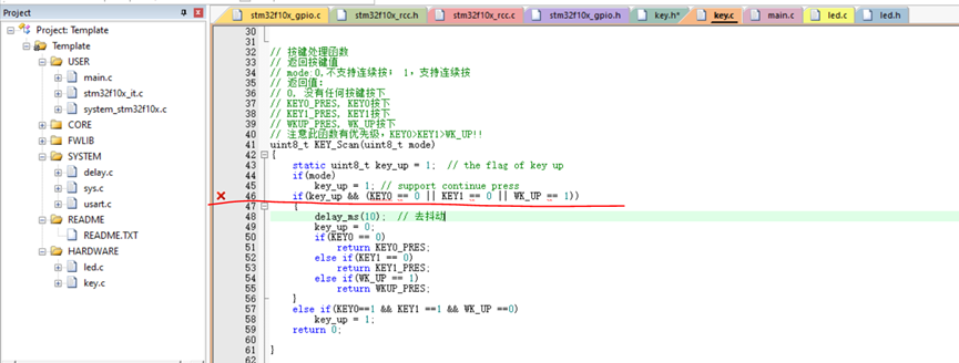 如下所示,在key.c文件中,KEY0无缘无故报错,KEY0在key.h中已经定义好了,但为什么还会报错呢?