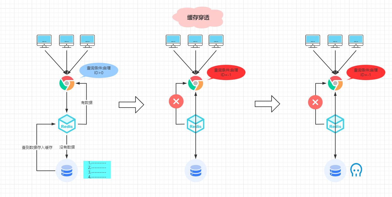 中间:黑客攻击故意查询id<0的数据,这时候缓存肯定没有此数据,就会查询数据库,但是数据库也没有数据,就无法把查到的数据放到缓存,下次查询还是得请求数据库。