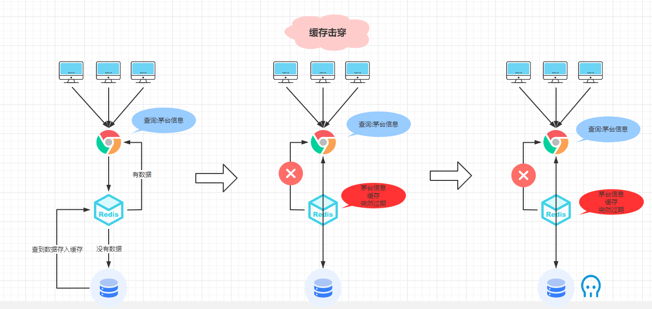 左边:正常访问茅台抢购信息,先查询缓存数据,有就返回,没有再查数据库返回,然后把数据再放入缓存中(没问题,正常流程)。
