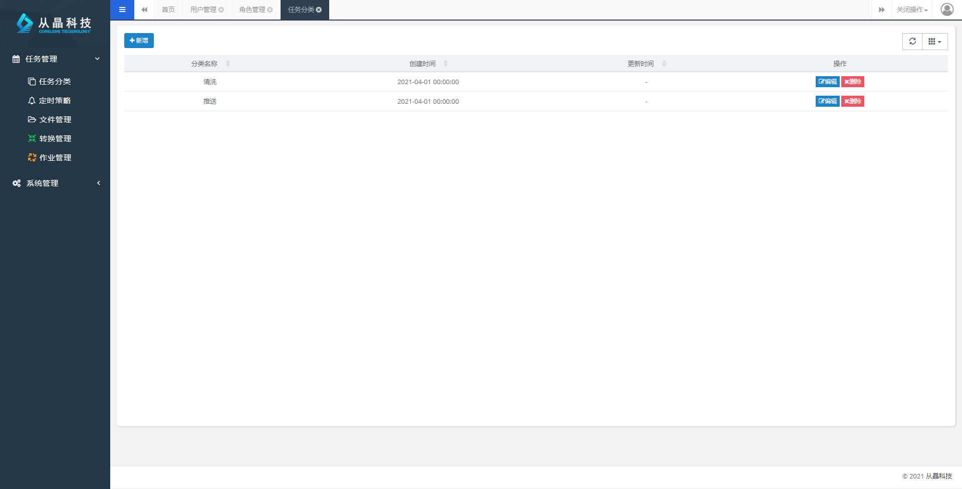 为方便kettle任务在KettlePack的管理,在进行作业和转换的管理之前,可以先创建任务分类。通过任务管理-->任务分类界面来对所有的任务类型进行管理。