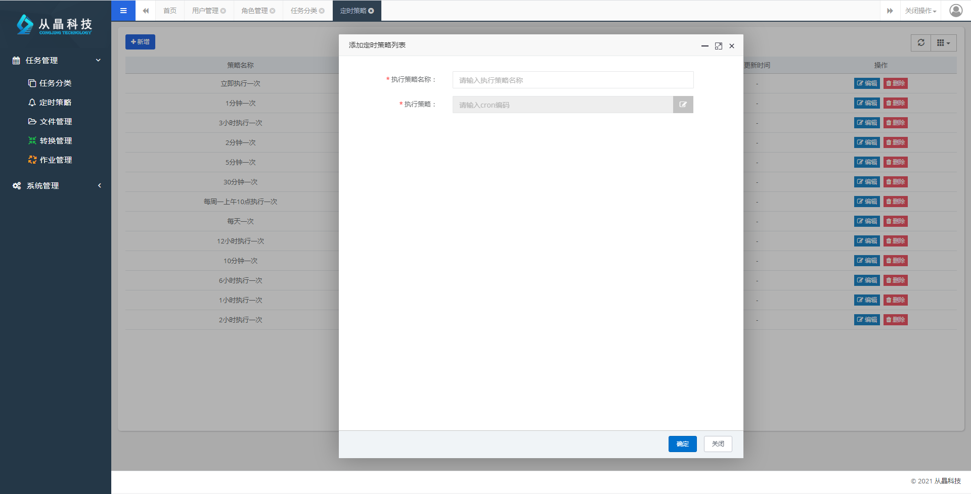在系统管理-->定时策略-->新增策略中,可以根据cron表达式来创建一条新的定时策略: