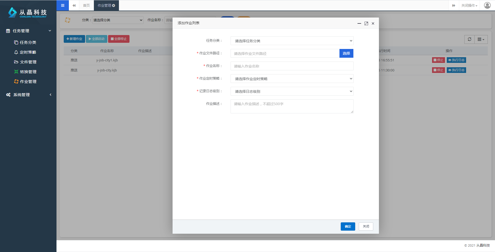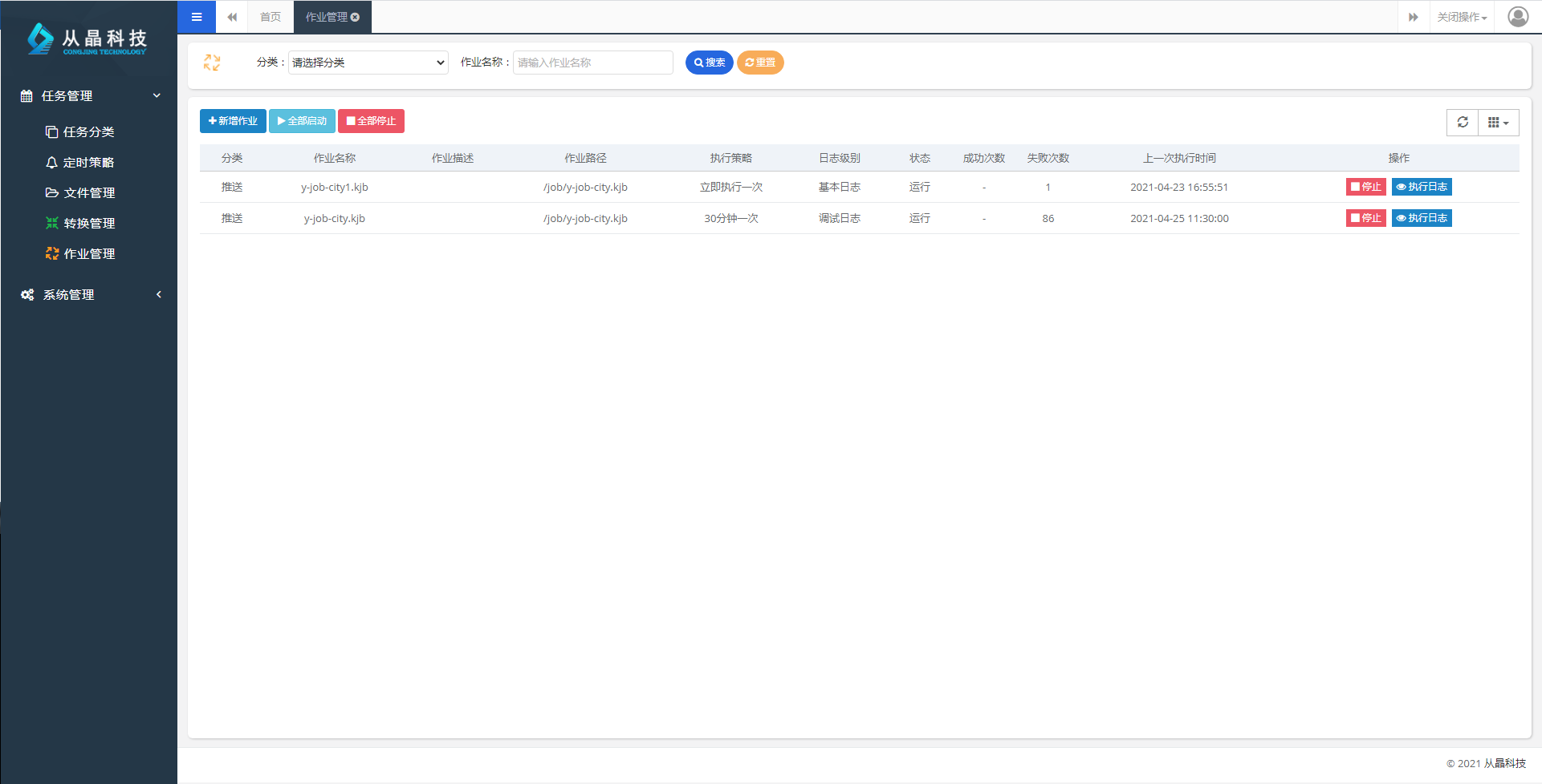 任务管理-->作业管理界面可以管理所有的作业任务,拥有新增、启动任务、停止任务、编辑、查询日志等功能。