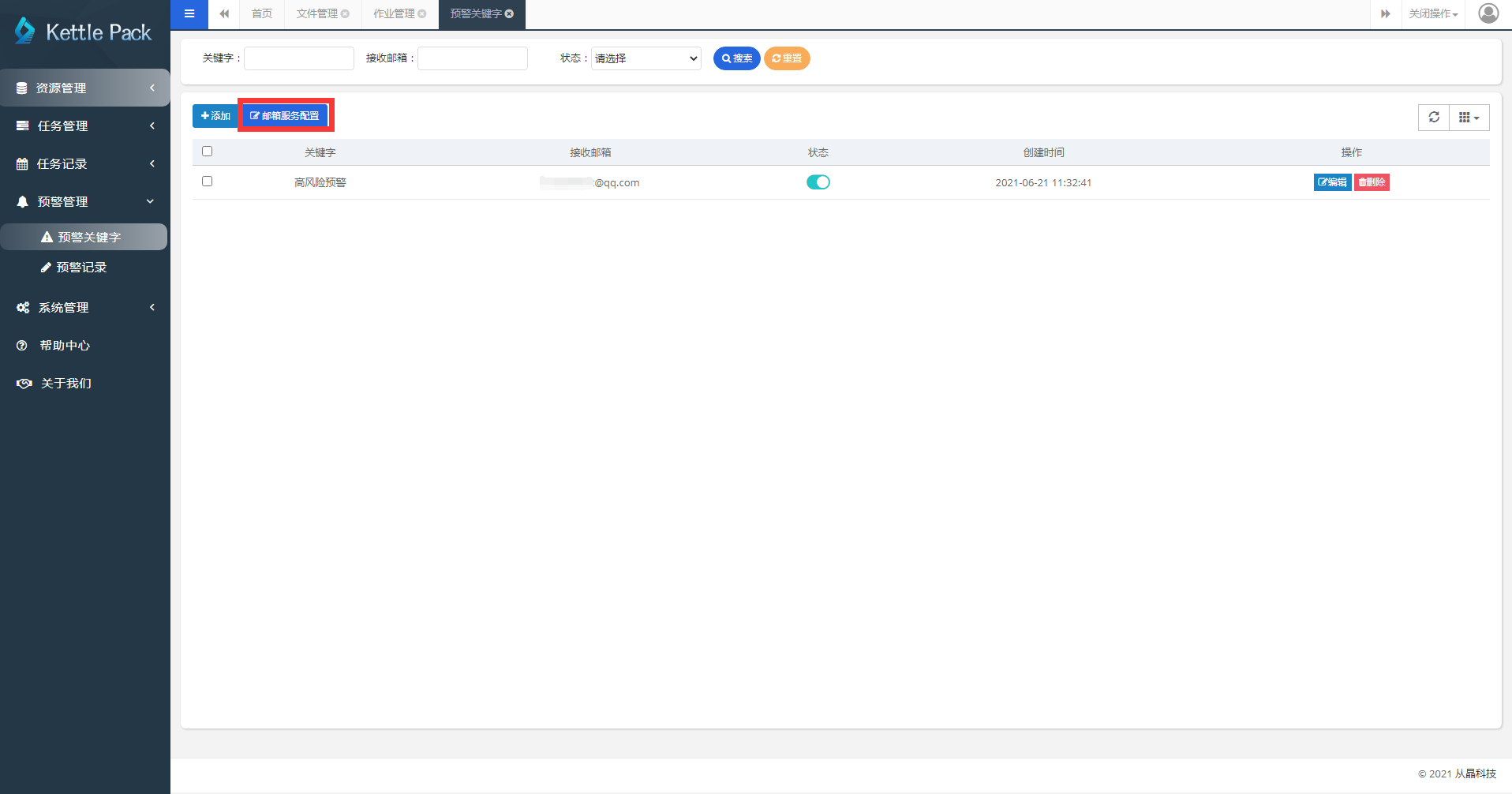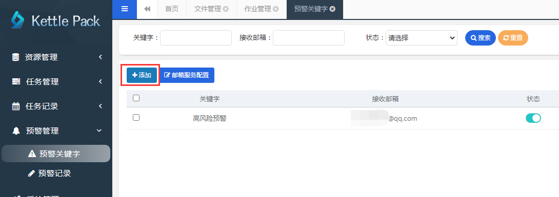 预警管理功能可以通过配置预警关键字的方式,当kettle任务运行时,系统自动监测kettle日志内容,当在日志中监测到“预警关键字”时,将自动将异常日志通过邮件的方式发送到对应的邮箱之中。