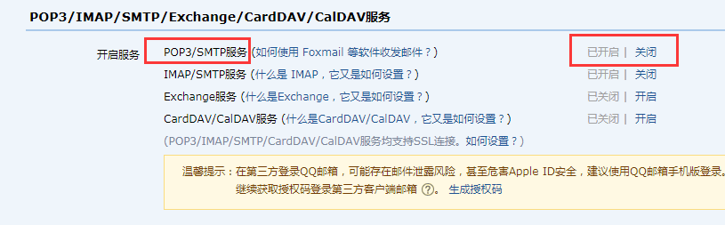 3)找到POP3/IMAP/SMTP/Exchange/CardDAV/CalDAV服务,并“开启”SMTP服务
