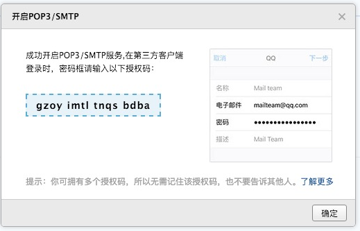 授权码:由对应的邮箱提供,授权第三方客户端的专用密码。
