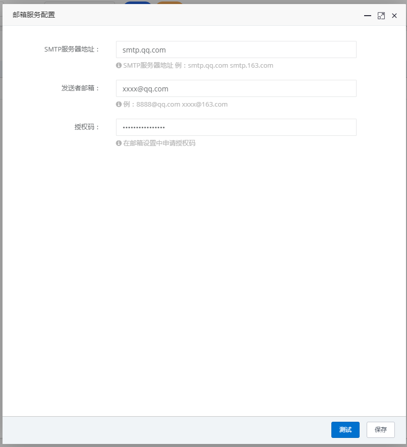 7)将获取的授权码填写到kettlepack邮箱服务配置界面,并点击“测试”按钮进行连接测试