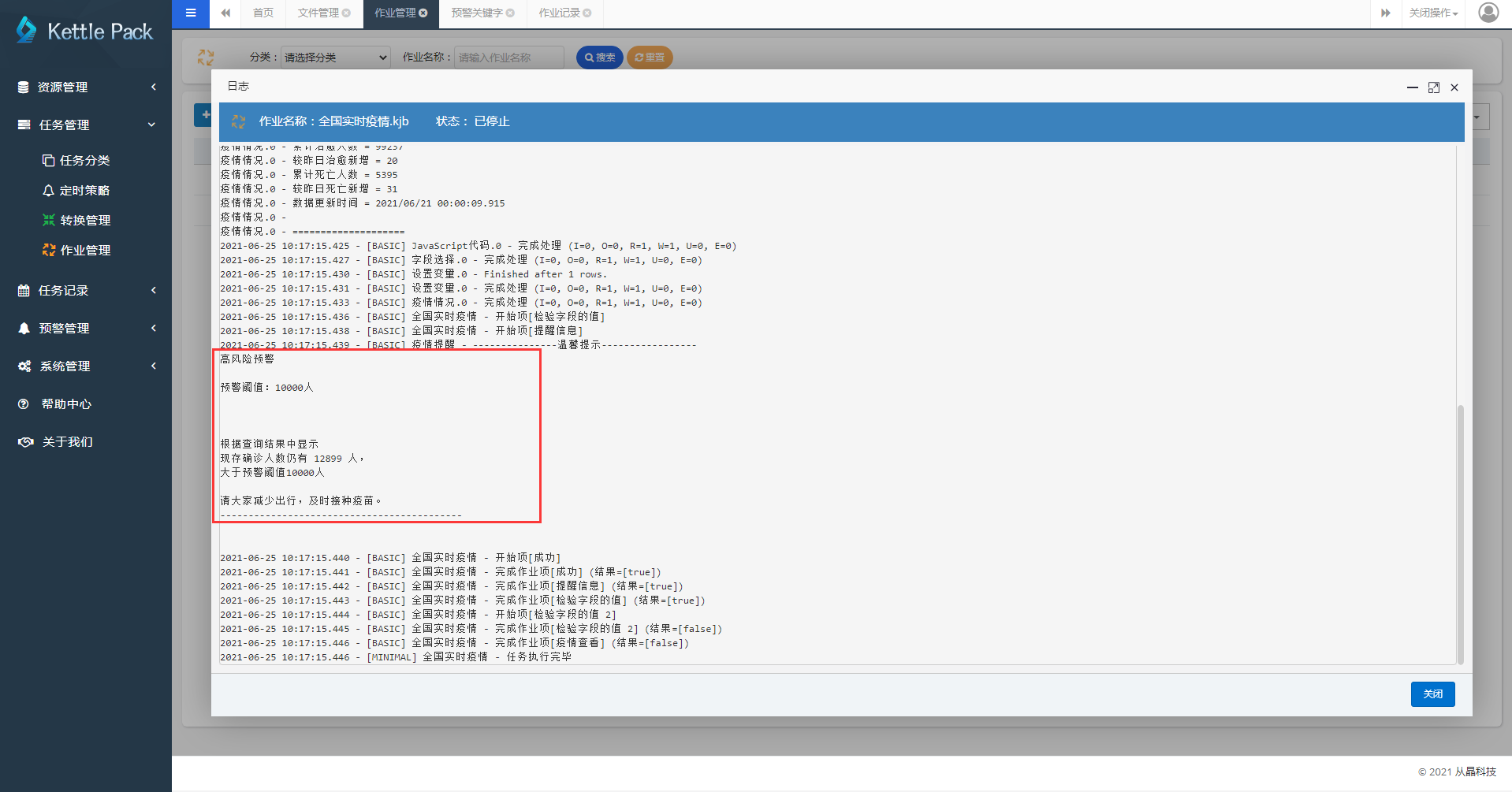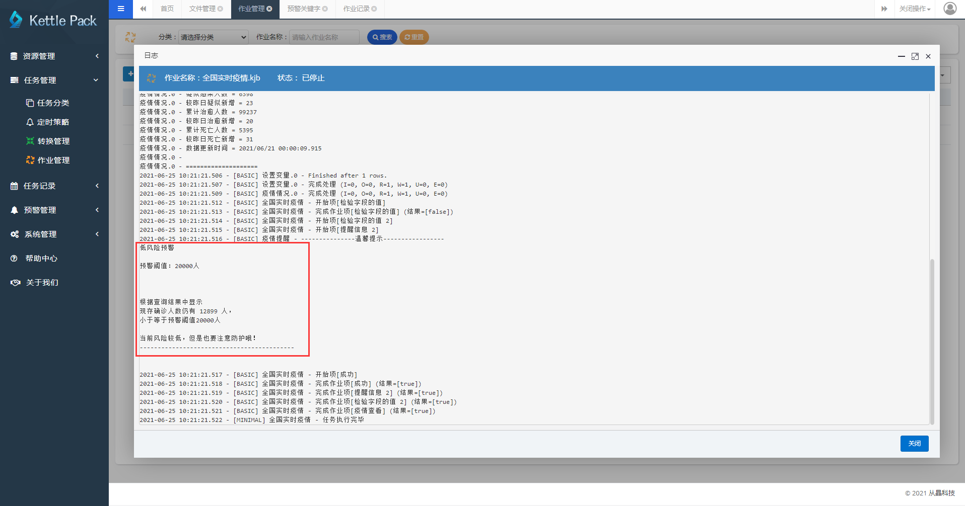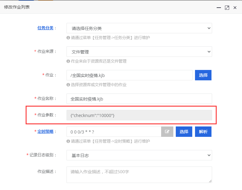 配置完成后,我配置了一个“全国实时疫情”的作业,该作业可以根据添加的“作业参数”来输出不同的作业日志: