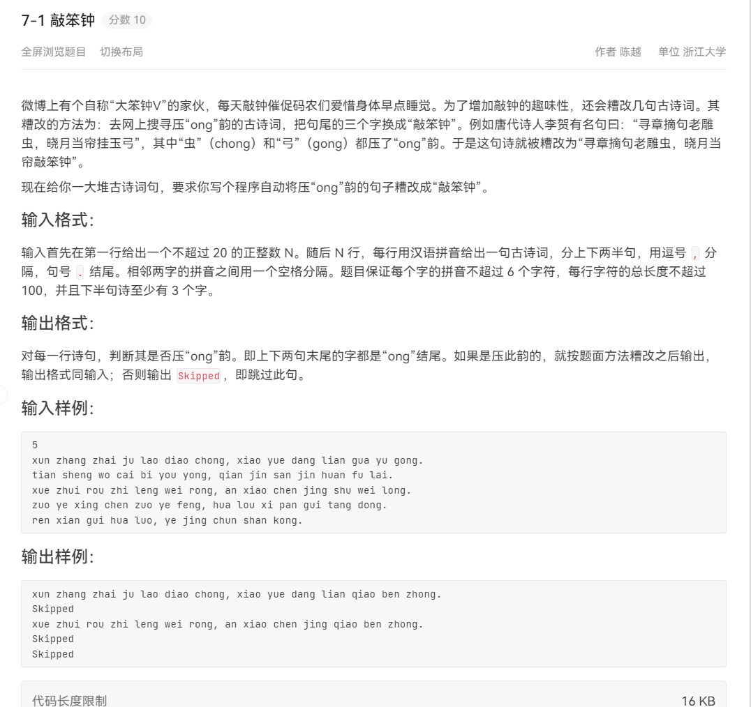 要注意的是,结尾处有英文的句号".",所以对len进行计数时需要多减一个1,其次第一次敲的时候看错题了,要押韵,所以还要建立pt数组来记录逗号","的位置,其他便是很正常的模拟,要注意把标记的数组初始值清零。