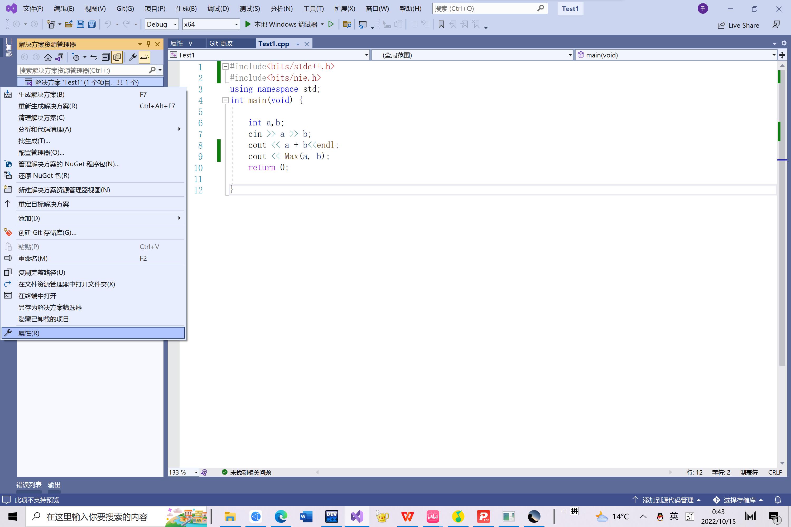 首先我们先找到Visual Studio编辑器中的“解决方案”,右键点击并在下拉菜单中找到属性并点击。