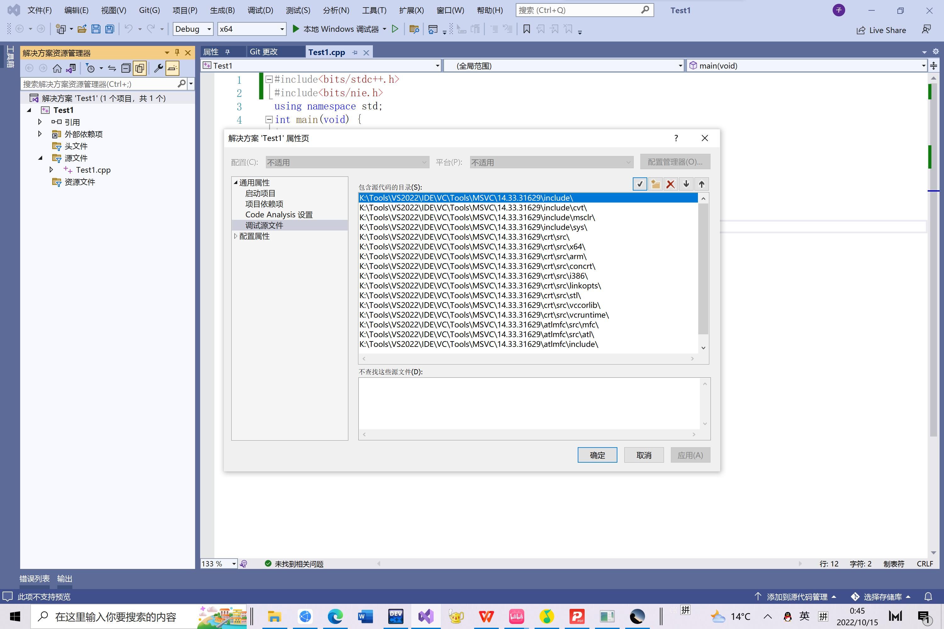 点击后会出现一个弹窗,在里面找到“调试源文件”,在右边列表中找到include文件夹的路径并复制下来。