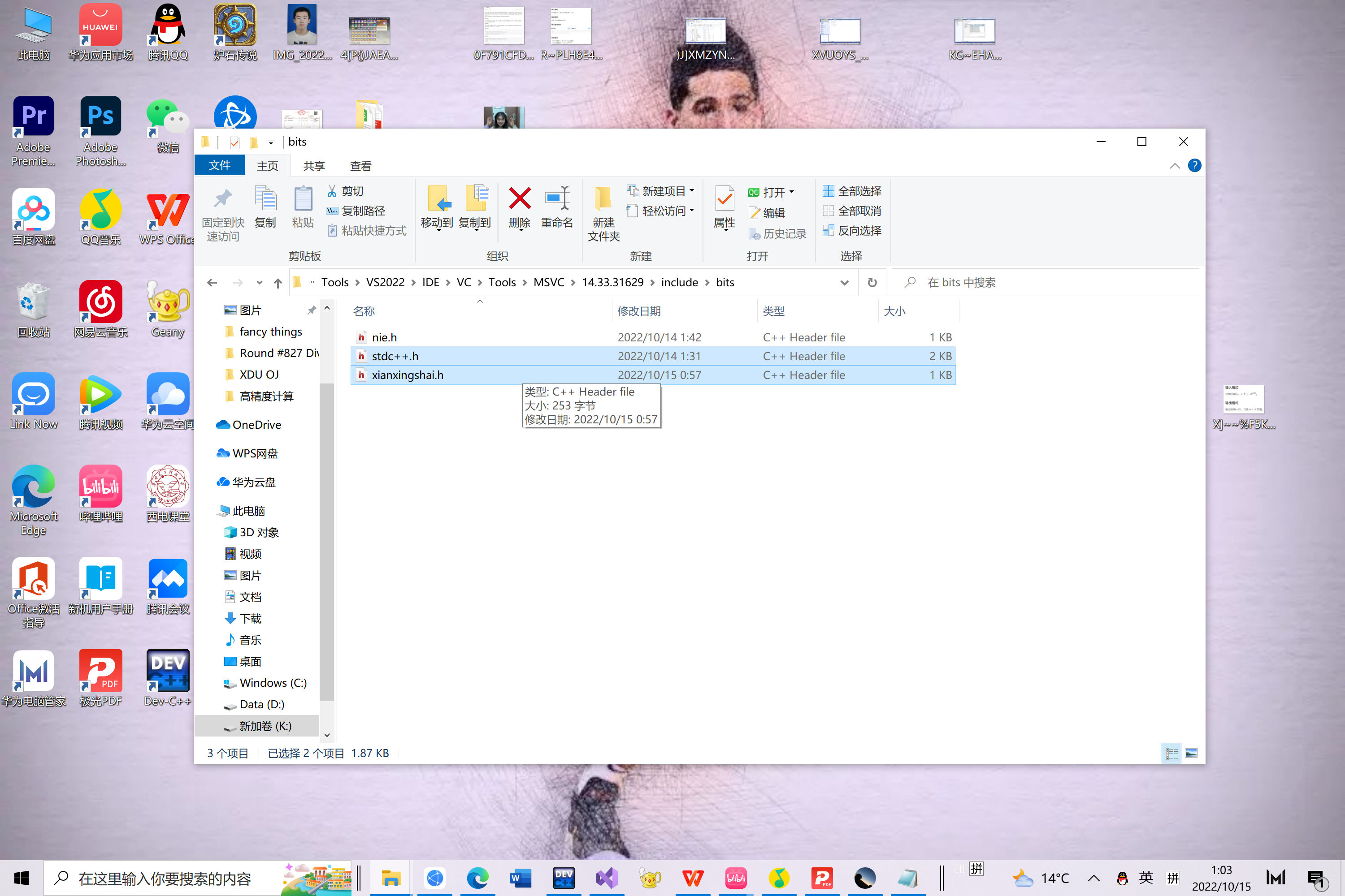 然后将txt文档的后缀名从.txt改为.h,并复制到文件夹bits中(这里会显示需要提供管理员权限,直接点就可以了,不需要管)。