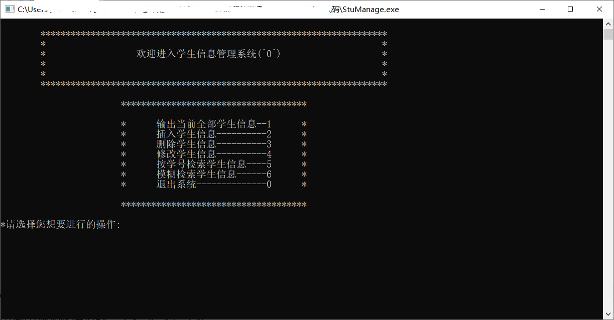 printf("\t* 欢迎进入学生信息管理系统(^0^) *\n");