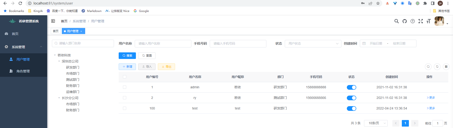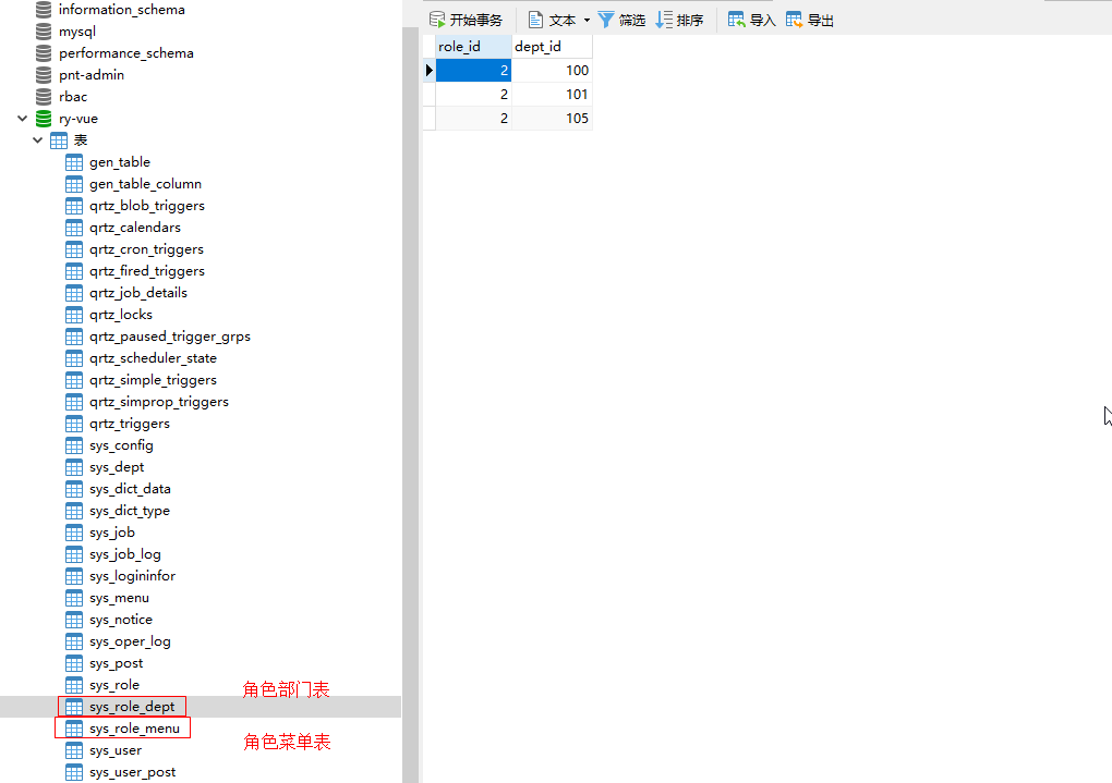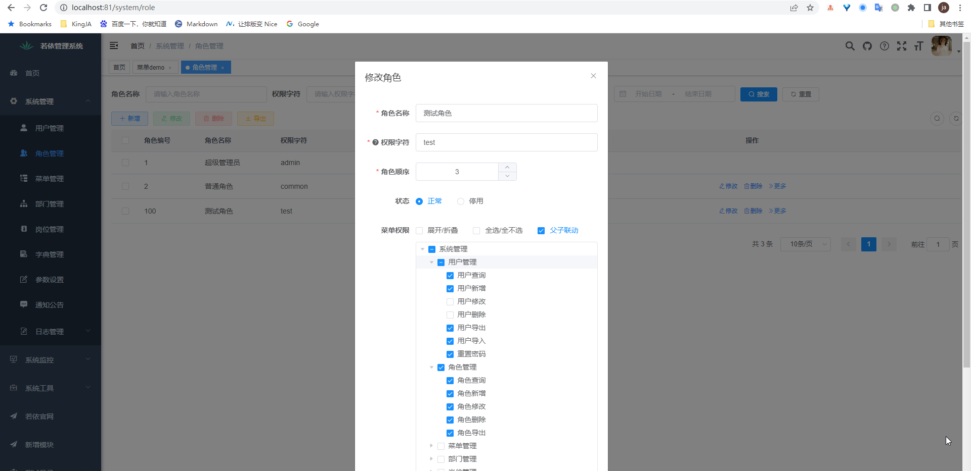 可以看出ruoyi还给角色赋予了部门管理的权限,因此角色权限这块,后面可以扩展的权限是无限的,可以根据需求追加。