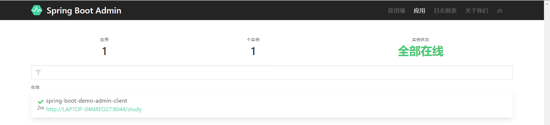 adminclient中出现上信息时,表明adminclient在adminserver中注册成功,此时可以访问adminserver的地址进入ui界面,如下图:
