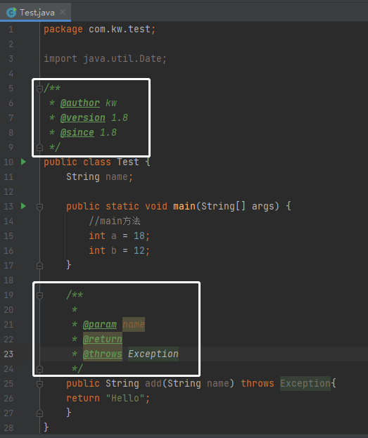 javadoc命令是用来生成开发者自己的API文档的。首先我们需要在代码附加下列信息(附在类之上即为类的注释,附在方法上即为方法的注释),用以标注下列信息。