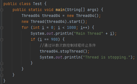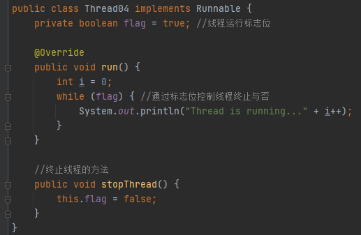 对于停止线程这个操作,一般不推荐使用JDK提供的stop()、destroy()方法(已废弃),建议使用一个标志位来对线程进行控制,当flag=false时,终止线程。