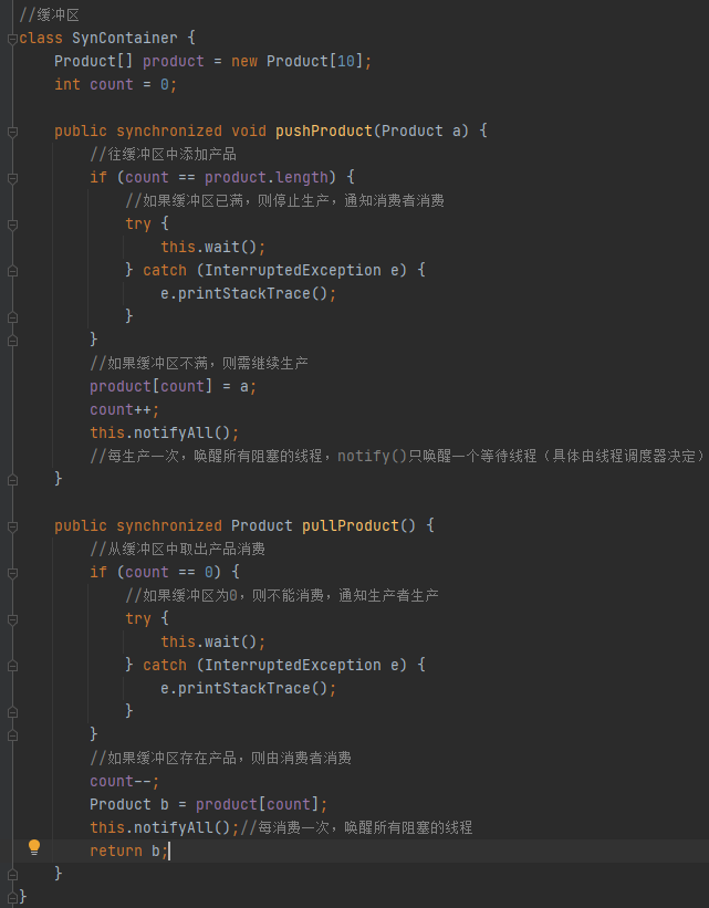 当生产者和消费者之间无缓冲区(即缓冲区为1)时,此时可以采用信号灯法来进行处理,即通过一个标志位为判断线程等待的条件(管程法中是通过count来判断),如标志位flag为真时,生产者等待;flag为假时,消费者等待。生产者和消费者运行后,用notifyAll()唤醒阻塞线程,并转换标志位。