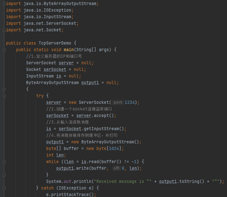 3)通过socket类中的getInputStream方法获取一个InputStream数据类型(变量),以此作为监听到的消息;