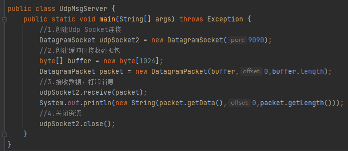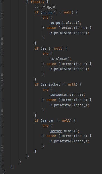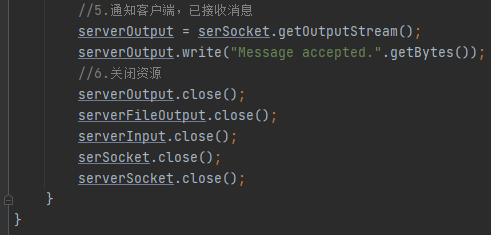 7)如果不需要继续监听消息和使用socket,则需要依次调用close方法将这些对象关闭,释放资源。