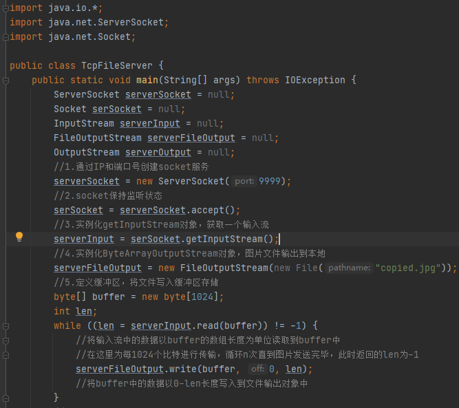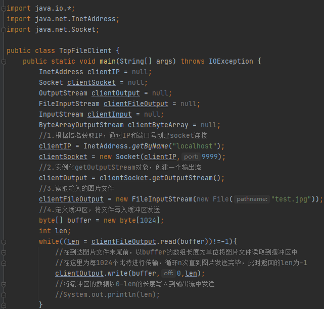 和TCP消息通信类似,主要用到了FileInputStream和FileOutputStream类。另外图片文件相对较大,输出流和输入流要多次通过缓冲区进行IO读写发送和接收。