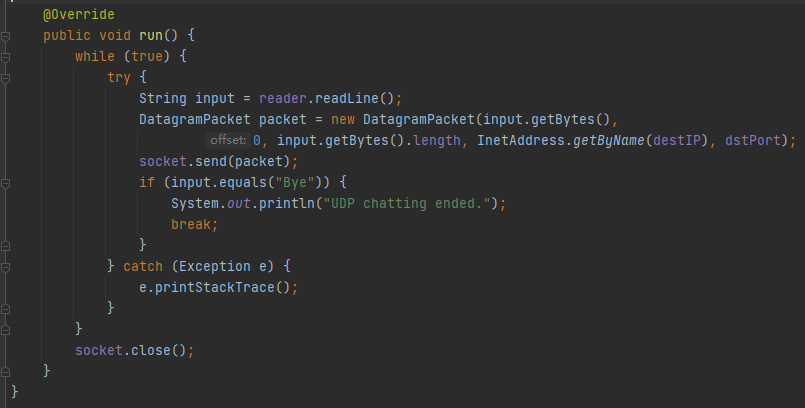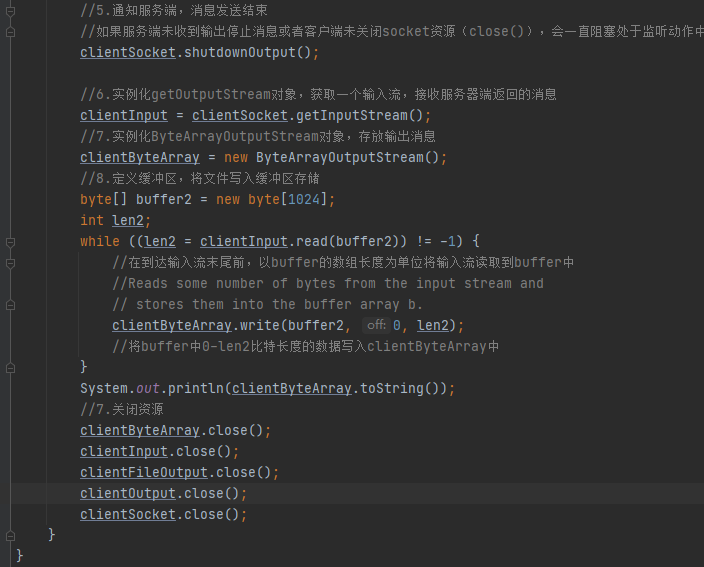 备注:客户端发送完数据后需要通过shutdownOutput()方法来通知服务器端(或直接关闭socket通信),说明消息发送已停止,否则在单线程中,服务器端会一直处于监听的阻塞状态,无法进行下一步。
