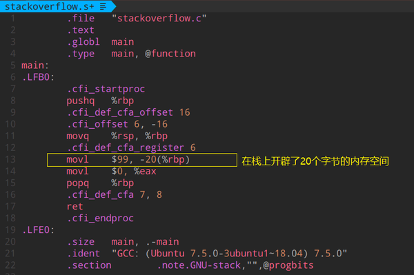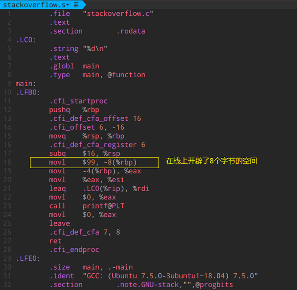 0运行结果显示并没有收到段错误,说明变量所含内存空间是合法的,已经进行了虚存映射。再对这段程序汇编,查看堆栈的变化:
