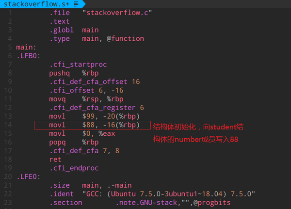 }在程序里定义了一个结构体变量stu,接下来汇编这段代码查看堆栈的变化: