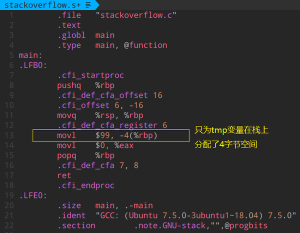 可以看到,编译器在栈上开辟了8个字节的空间,这其中高4个字节是定义tmp变量分配的,低4个字节则是分配给了value变量。虽然我们在初始时,只声明了value,但是在printf函数中对其进行了访问,这个操作会让编译器为value变量分配内存。