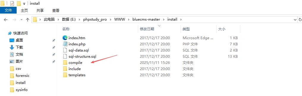 访问 http://127.0.0.1/bluecms-master/install/ 如果是空白页面,可以尝试去 compile 删除 php 文件