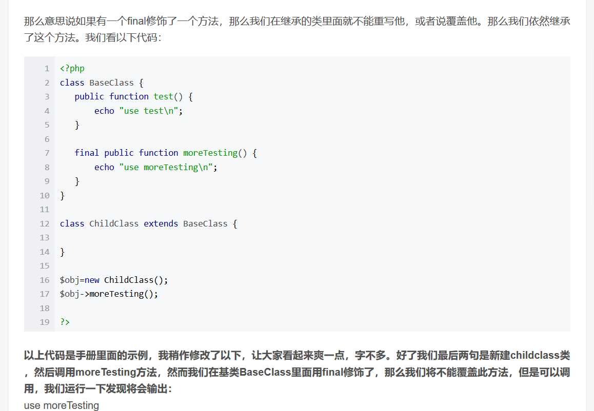 final :类属性(成员)不能被定义为 final,只有类和方法才能被定义为 final。。作用: 使用final标识的类,不能被继承。在类中使用final标识的成员方法,在子类中不能覆盖。总结:final表示为最终的意思,所以使用final关键字的类或者类中的成员方法是不能被更改的。但是我们在子类中依然可以继承这个方法