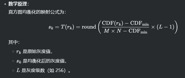 HE原理,(根据图像灰度直方图统计信息如累积分布函数调整图像灰度分布使得其不同灰度级的概率分布函数相同)