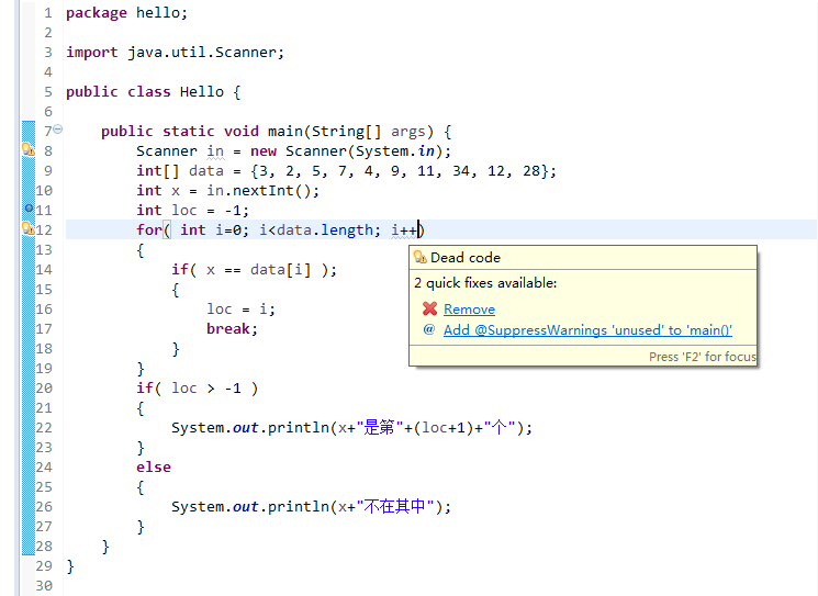 截图中可以看到,在for循环的“i++”位置中出现了“dead code”的警告