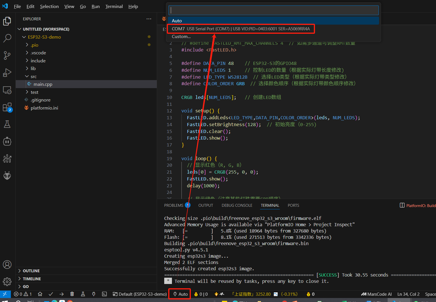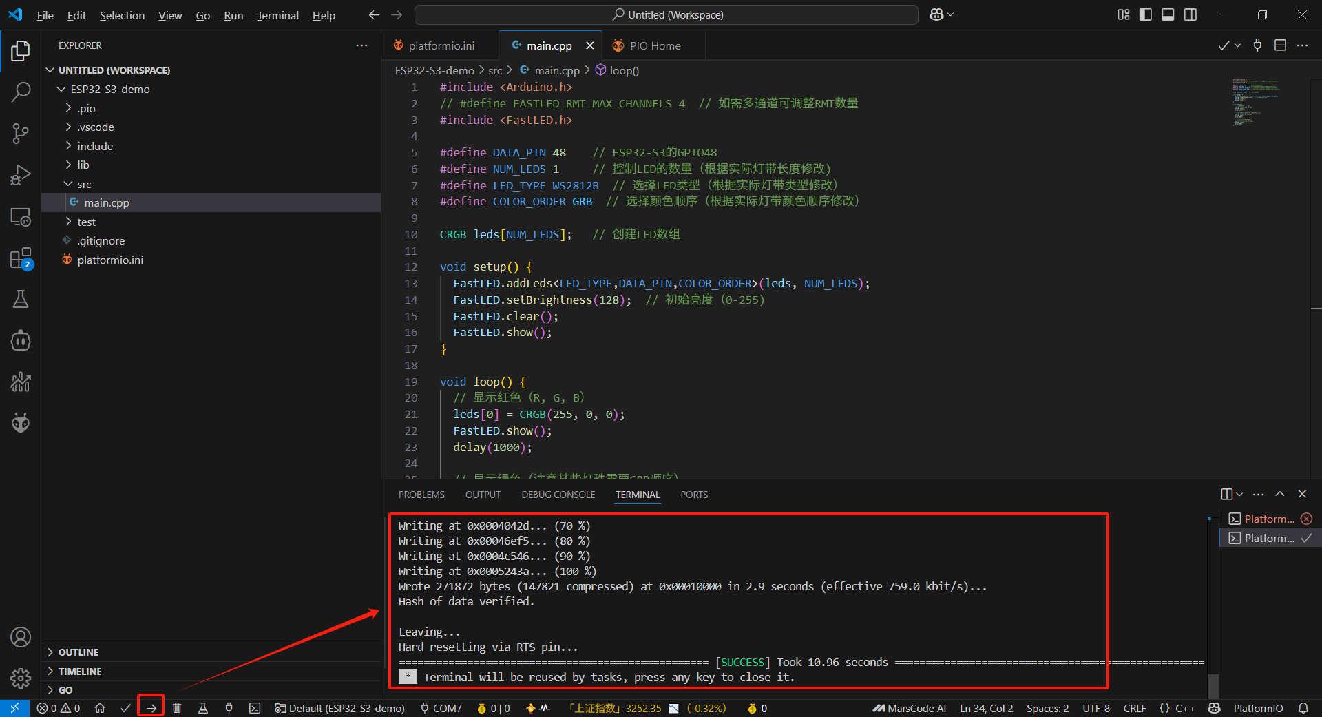 本教程将带你从零开始使用 VSCode 和 PlatformIO IDE 开发 ESP32项目。主要通过配置ESP32-S3芯片的项目,实现使用 FastLED 库控制 WS2812 LED 灯在不同颜色之间的闪烁,带你入门ESP32从项目新建->项目配置->项目烧录的整个过程。