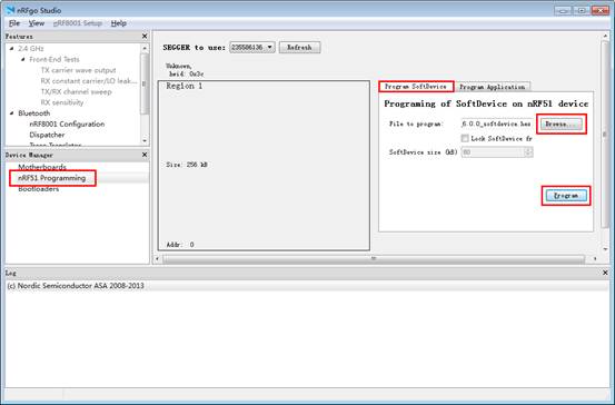 选择nRF51 Programming > Program SoftDevice> Browse(选择相应的蓝牙协议栈) > Program(等待蓝牙协议栈下载完毕)。(我们使用的协议栈文件s110_nrf51822_6.0.0_softdevice.hex,是通过解压\Software\s110_nrf51822_6.0.0.zip得到的。)