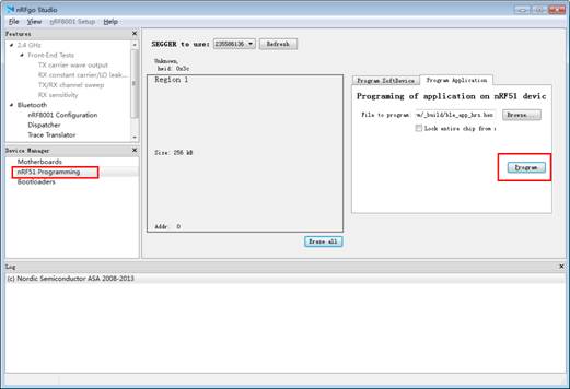 此时,请使用nRFgo Studio左下的“nRF51 Programming”,之后点击“Program Application”选项框下载。