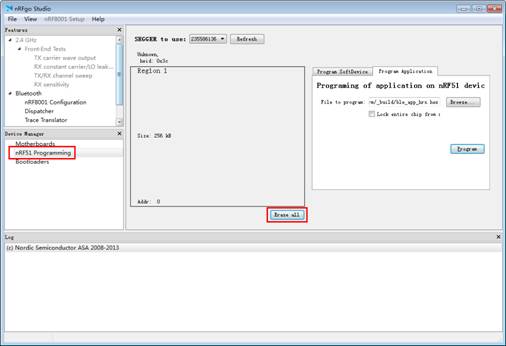 a) 开发板出厂时已预装程序,下载其他程序之前,需使用nRFgo Studio全部擦除程序。首先点击“nRF51 Programming”,之后点击“Erase all”全部擦除后方可烧写其它程序。