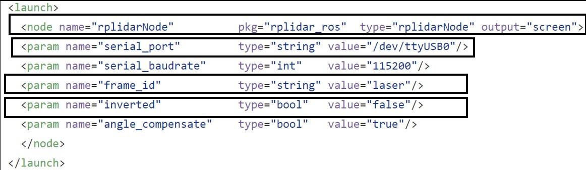 rplidar_ros给出的rplidar.launch,实际使用中依据具体的使用往往关注的参数有 端口号(serial_port)、坐标系名称(frame_id)、正反装(inverted)。
