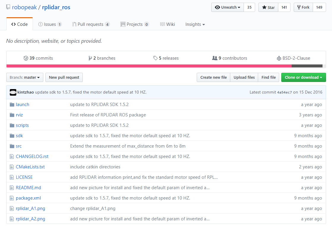 rplidar_ros的github主要包含package对应的源码和package的版本管理和开发者问题对话。